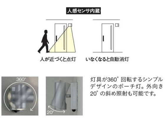 仕様 人感センサー内蔵(ON/OFFタイプ) 光源:LEDモジュール 電球:LED(電球色)7.5W(2700K) 光束 310lm 調光器併用不可 光源寿命 40,000時間 LED交換不可 入力電圧:AC100V 指定ワット数以上の電球を使用しますと火災などの原因になりますので付属の取り扱い説明書をご覧になり規定ワット数以下の電球をご使用ください。